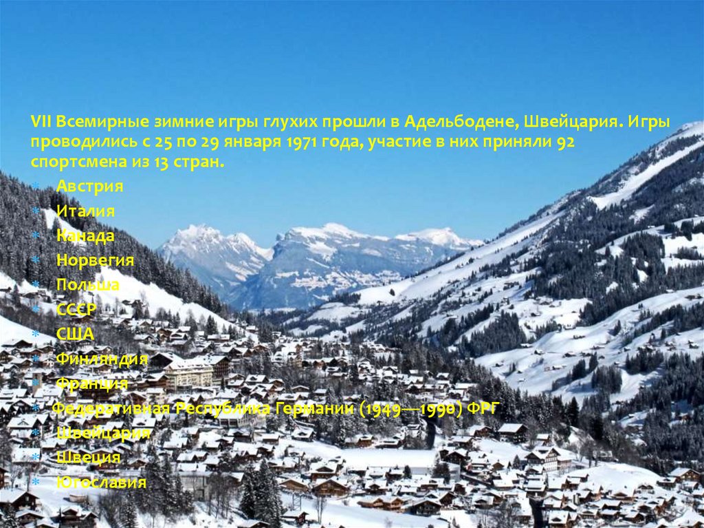 VII Всемирные зимние игры глухих прошли в Адельбодене, Швейцария. Игрыпроводились с 25 по 29 января 1971 года, участие в них приняли 92