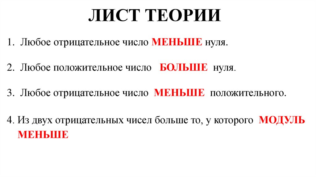 ЛИСТ ТЕОРИИ1. Любое отрицательное число МЕНЬШЕ нуля.