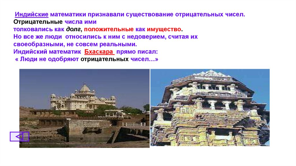 Индийские математики признавали существование отрицательных чисел.Отрицательные числа ими