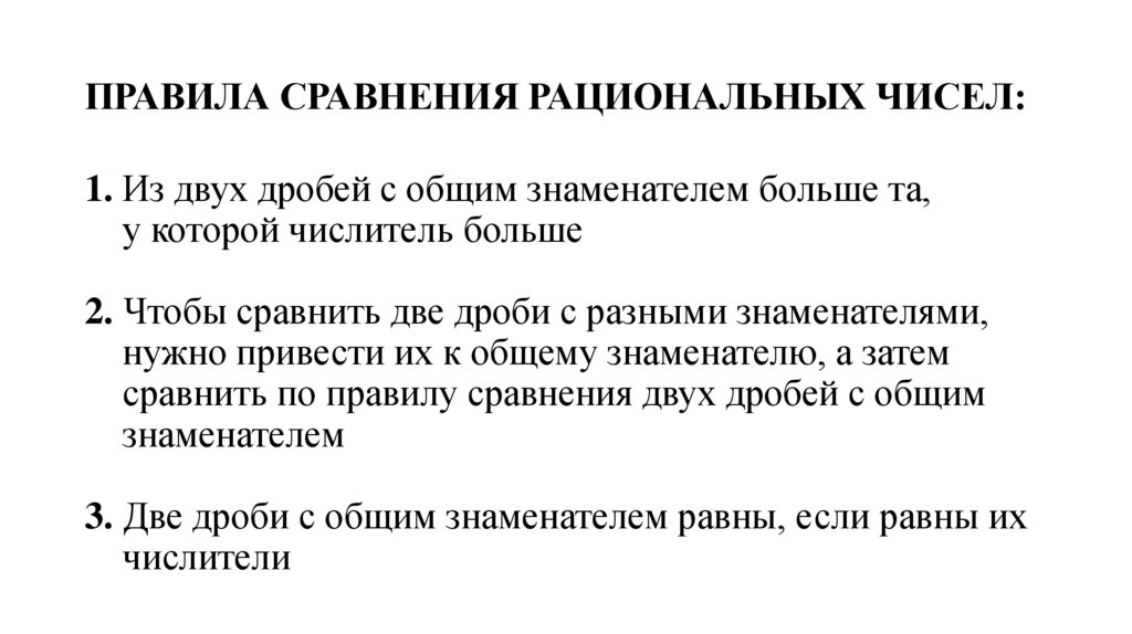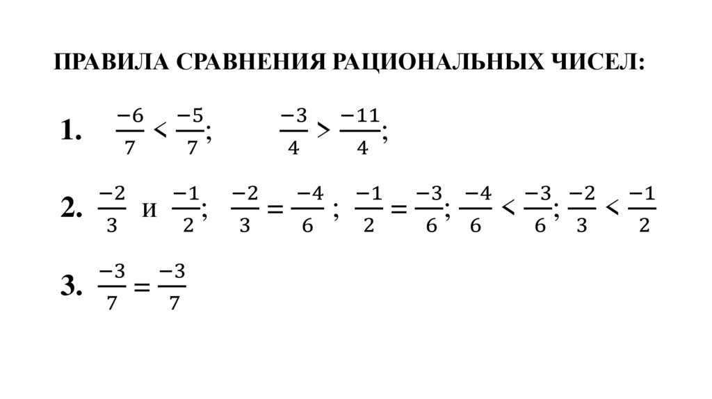 ПРАВИЛА СРАВНЕНИЯ РАЦИОНАЛЬНЫХ ЧИСЕЛ:1. Из двух дробей с общим знаменателем больше та,