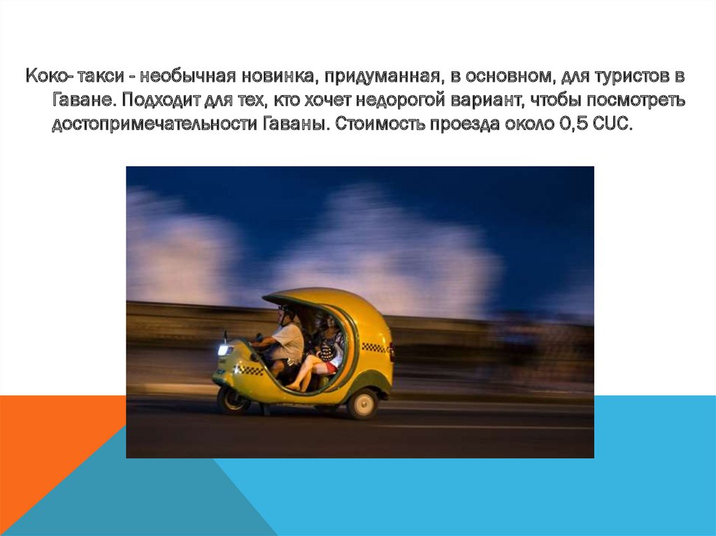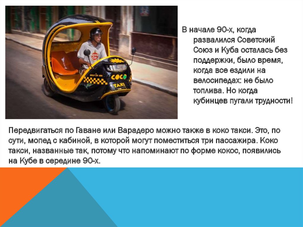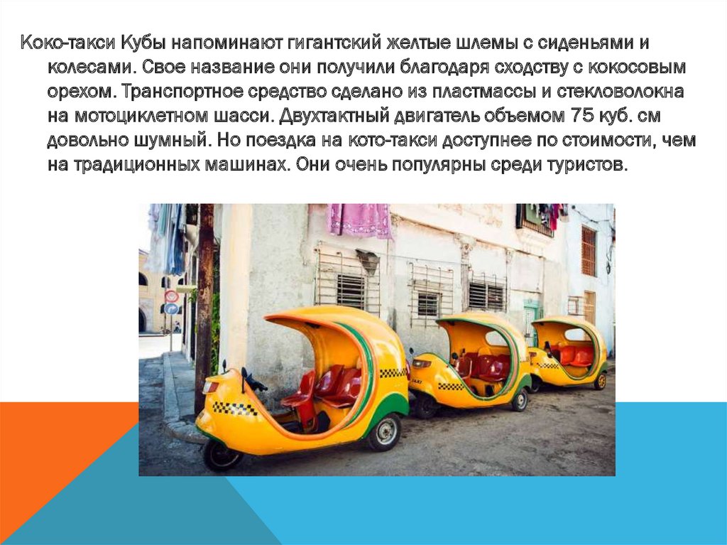 Коко-такси Кубы напоминают гигантский желтые шлемы с сиденьями иколесами. Свое название они получили благодаря сходству с кокосовым