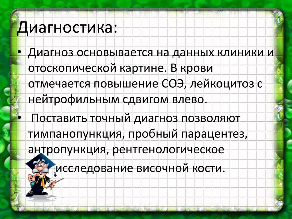 Диагностика:• Диагноз основывается на данных клиники и
