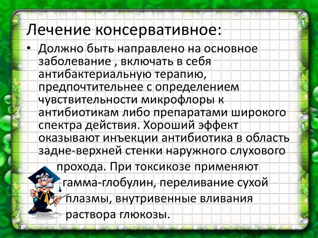 Лечение консервативное:• Должно быть направлено на основное