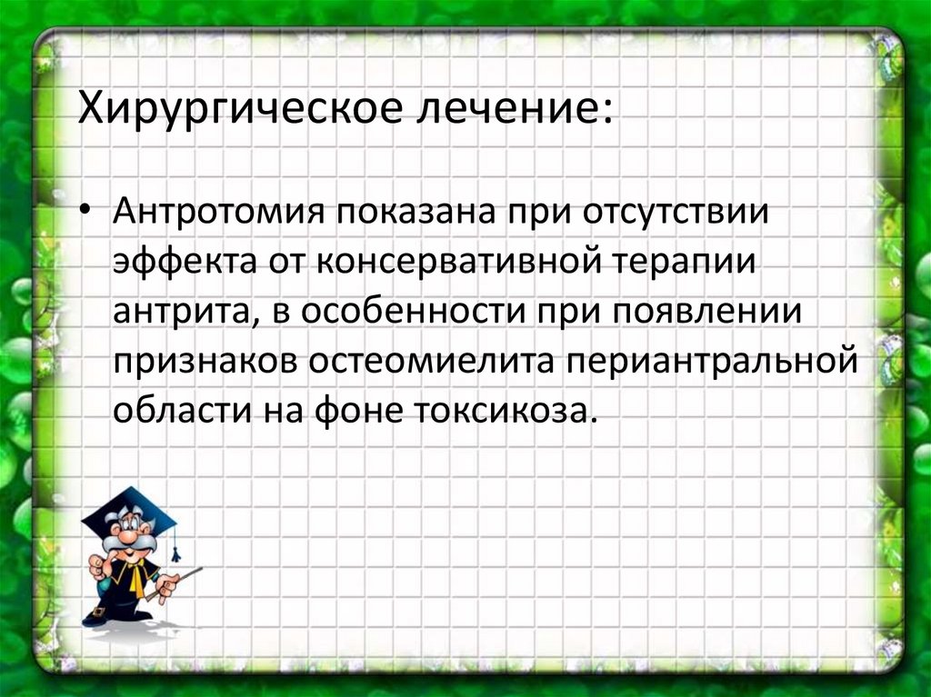 Хирургическое лечение:• Антротомия показана при отсутствии