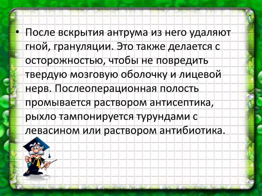 • После вскрытия антрума из него удаляютгной, грануляции. Это также делается с