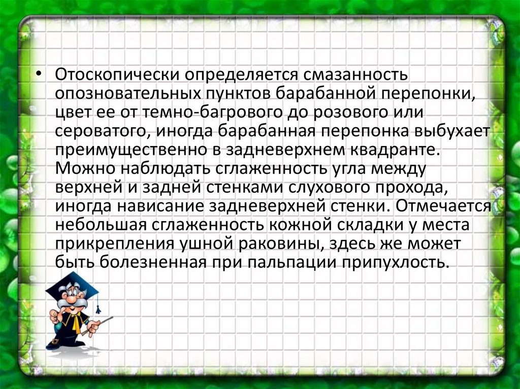 • Отоскопически определяется смазанностьопозновательных пунктов барабанной перепонки,