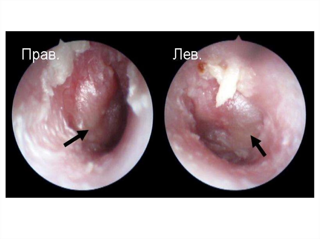 сероватого, иногда барабанная перепонка выбухает