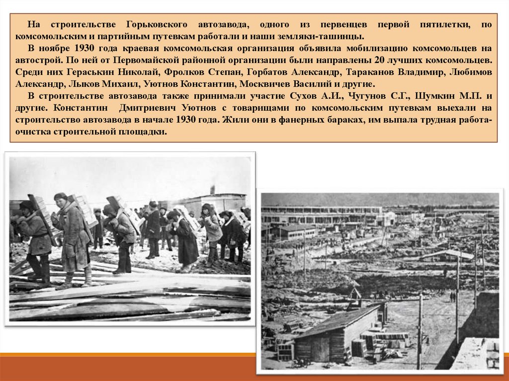 строительство автозавода в начале 1930 года. Жили они в фанерных бараках, им выпала трудная работаочистка строительной площадки.