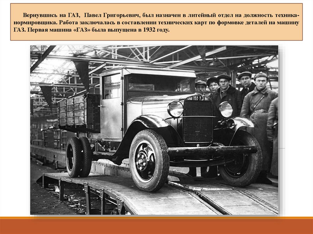 Вернувшись на ГАЗ, Павел Григорьевич, был назначен в литейный отдел на должность техниканормировщика. Работа заключалась в составлении технических карт по формовке деталей на машинуГАЗ. Первая машина «ГАЗ» была выпущена в 1932 году.