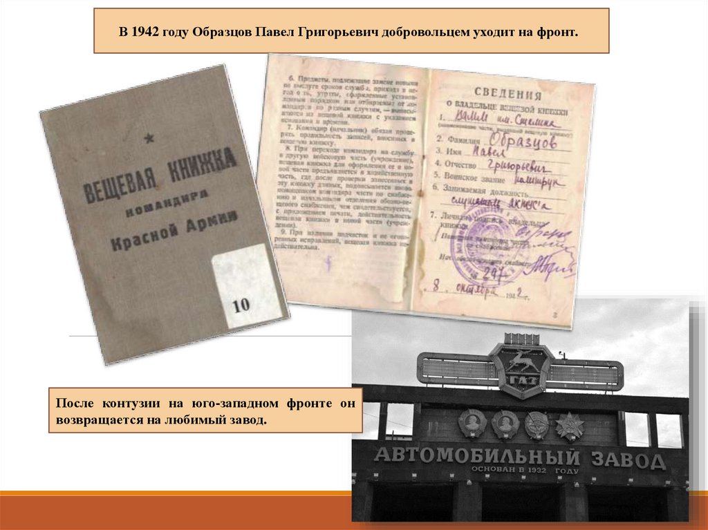 В 1942 году Образцов Павел Григорьевич добровольцем уходит на фронт.После контузии на юго-западном фронте он