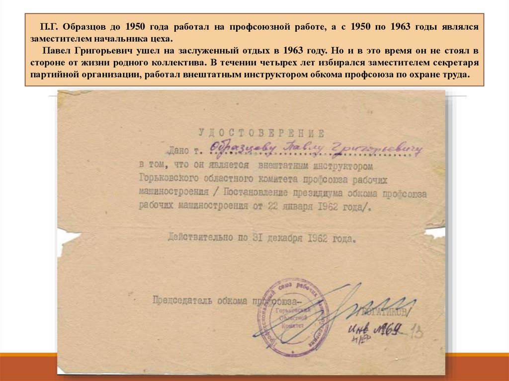 П.Г. Образцов до 1950 года работал на профсоюзной работе, а с 1950 по 1963 годы являлсязаместителем начальника цеха.