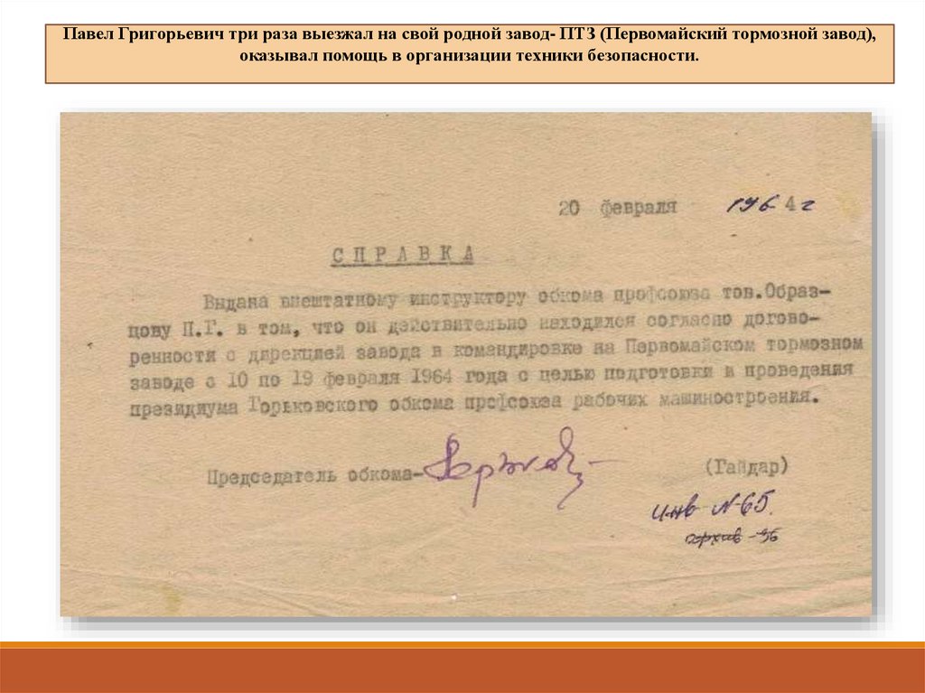 Павел Григорьевич три раза выезжал на свой родной завод- ПТЗ (Первомайский тормозной завод),оказывал помощь в организации техники безопасности.