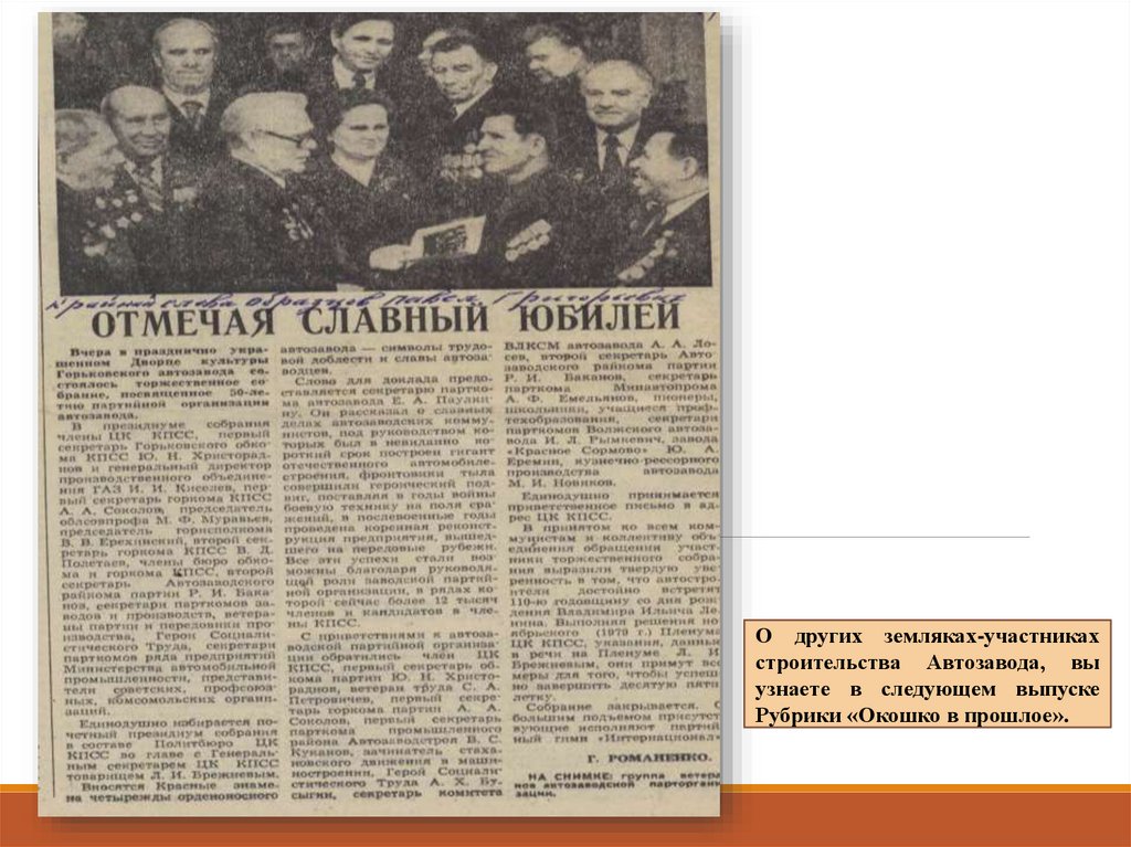 В строительстве автозавода также принимали участие Сухов А.И., Чугунов С.Г., Шумкин М.П. и