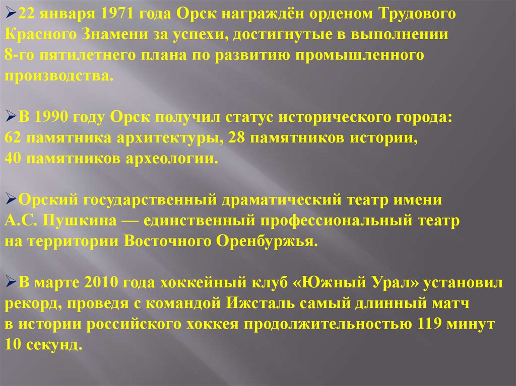 22 января 1971 года Орск награждён орденом ТрудовогоКрасного Знамени за успехи, достигнутые в выполнении