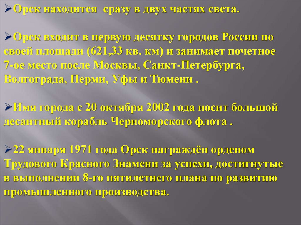 Орск находится сразу в двух частях света.Орск входит в первую десятку городов России по