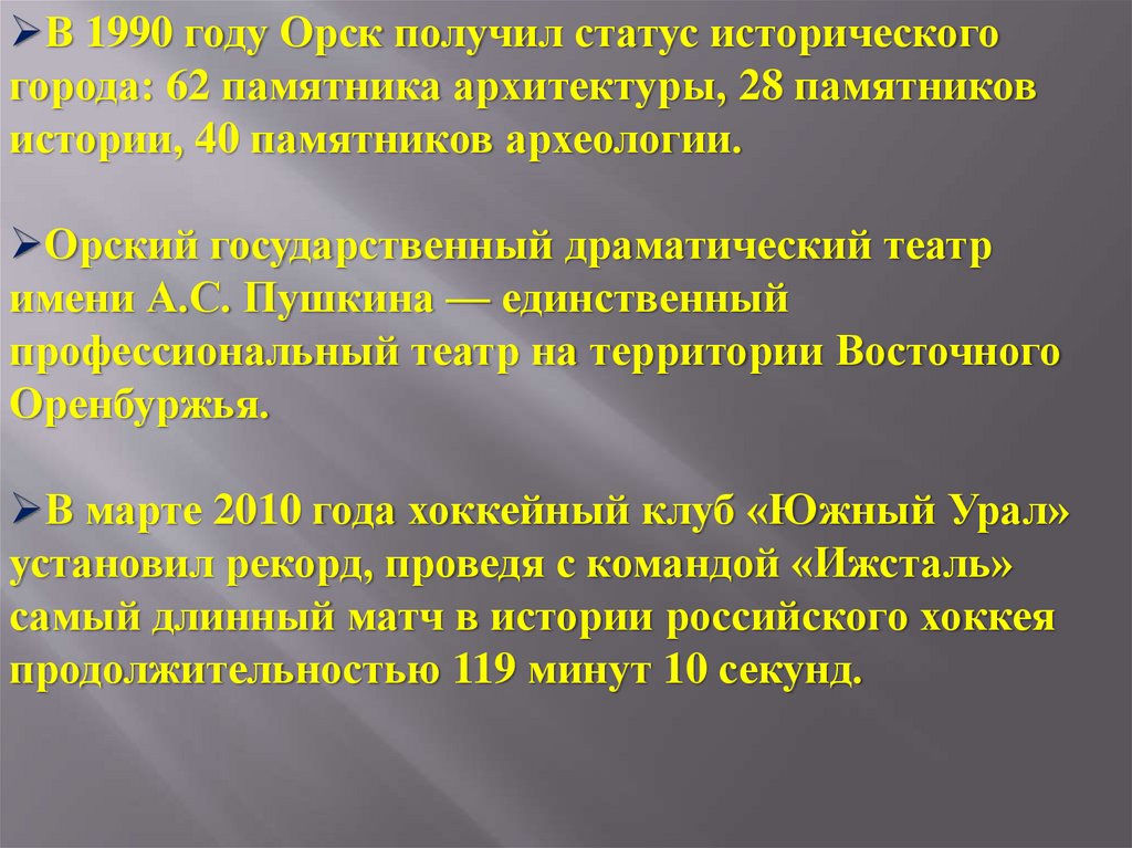 В 1990 году Орск получил статус историческогогорода: 62 памятника архитектуры, 28 памятников