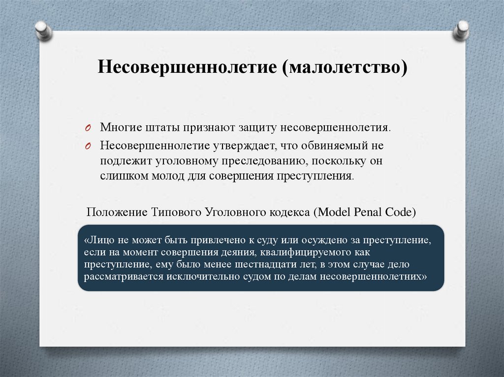 Несовершеннолетие (малолетство)O Многие штаты признают защиту несовершеннолетия.