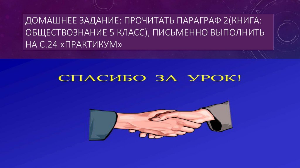 ДОМАШНЕЕ ЗАДАНИЕ: ПРОЧИТАТЬ ПАРАГРАФ 2(КНИГА:ОБЩЕСТВОЗНАНИЕ 5 КЛАСС), ПИСЬМЕННО ВЫПОЛНИТЬ