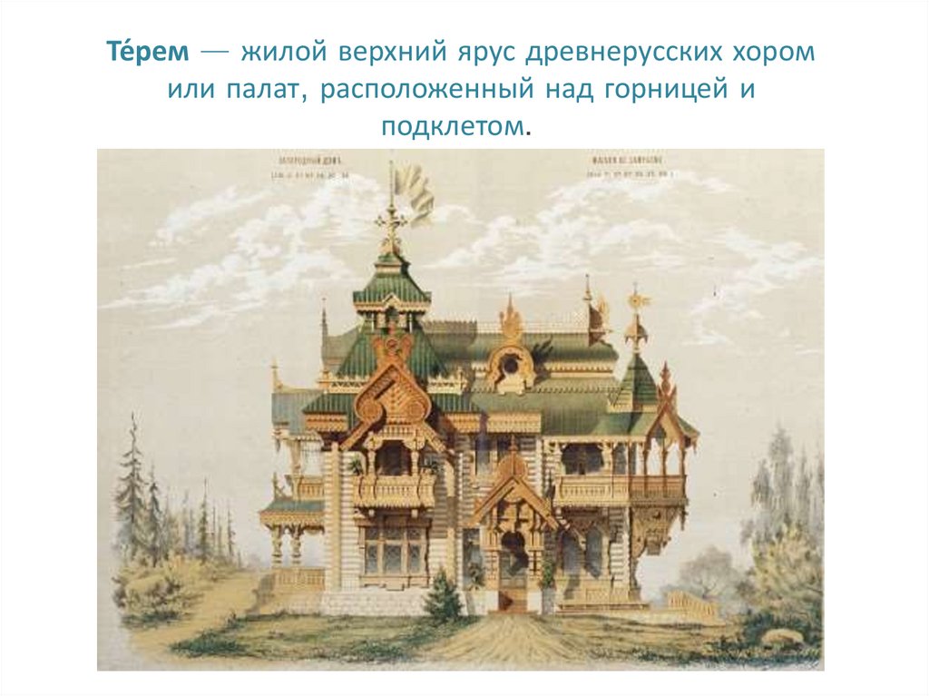 Те́рем — жилой верхний ярус древнерусских хоромили палат, расположенный над горницей и