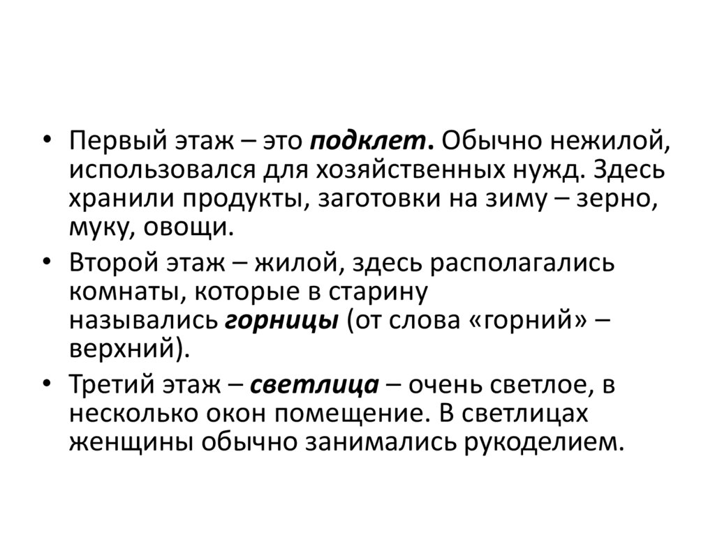 • Первый этаж – это подклет. Обычно нежилой,использовался для хозяйственных нужд. Здесь