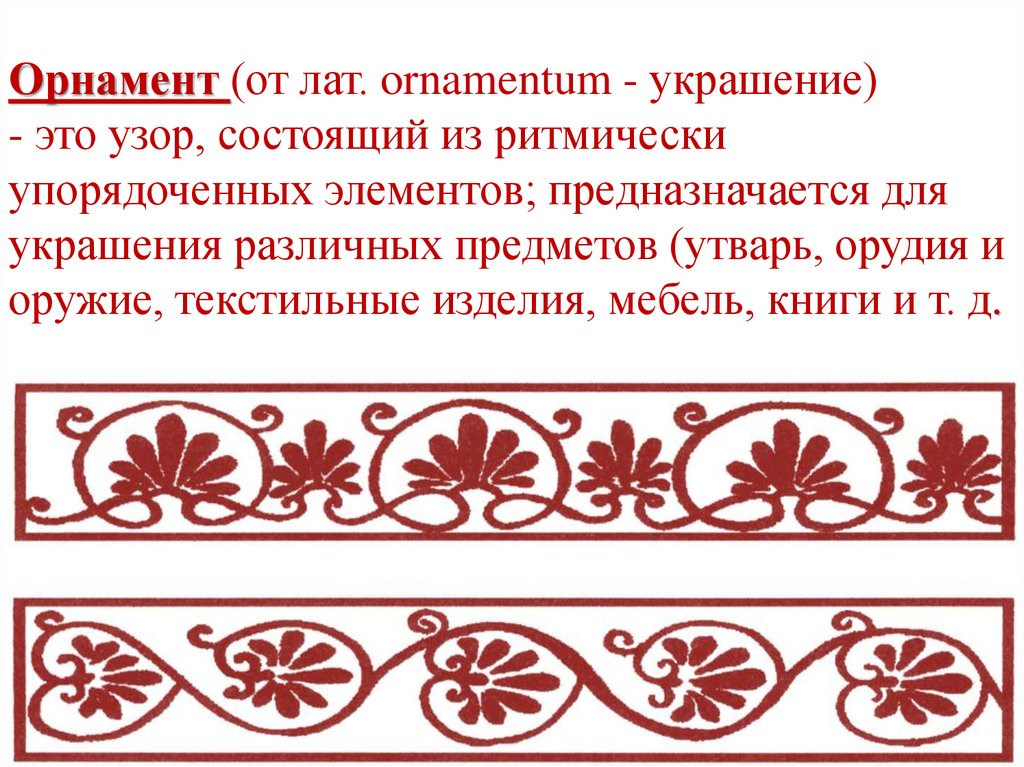 Орнамент (от лат. ornamentum - украшение)- это узор, состоящий из ритмически
