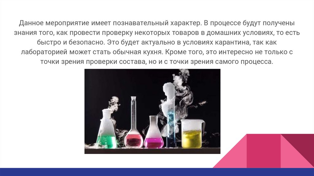 Данное мероприятие имеет познавательный характер. В процессе будут полученызнания того, как провести проверку некоторых товаров в домашних условиях, то есть