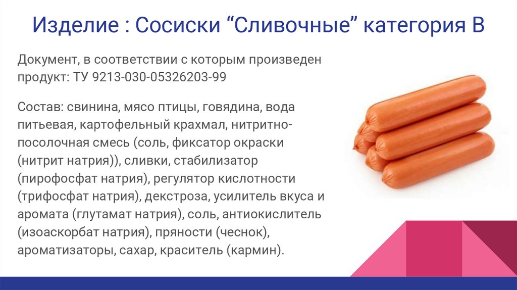Изделие : Сосиски “Сливочные” категория ВДокумент, в соответствии с которым произведен