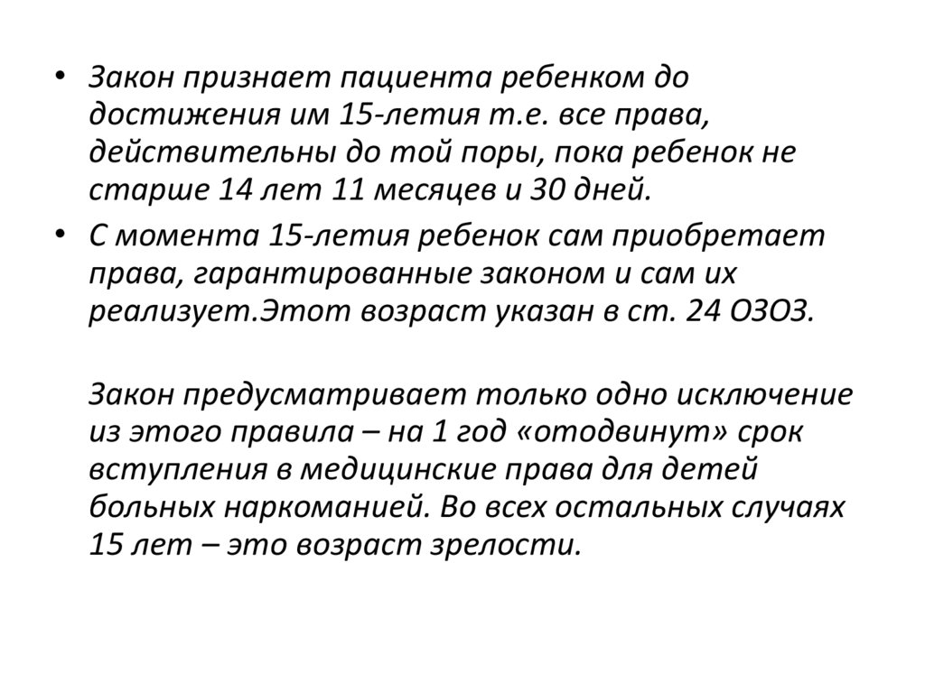 • Закон признает пациента ребенком додостижения им 15-летия т.е. все права,