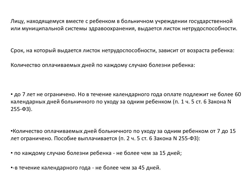 •Количество оплачиваемых дней больничного по уходу за одним ребенком от 7 до 15