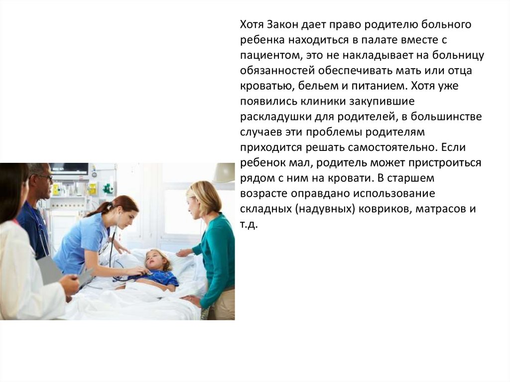 Хотя Закон дает право родителю больногоребенка находиться в палате вместе с