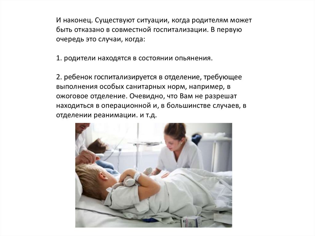 И наконец. Существуют ситуации, когда родителям можетбыть отказано в совместной госпитализации. В первую