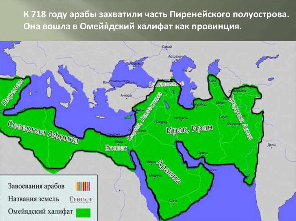 К 718 году арабы захватили часть Пиренейского полуострова.Она вошла в Омейя̀дский халифат как провинция.