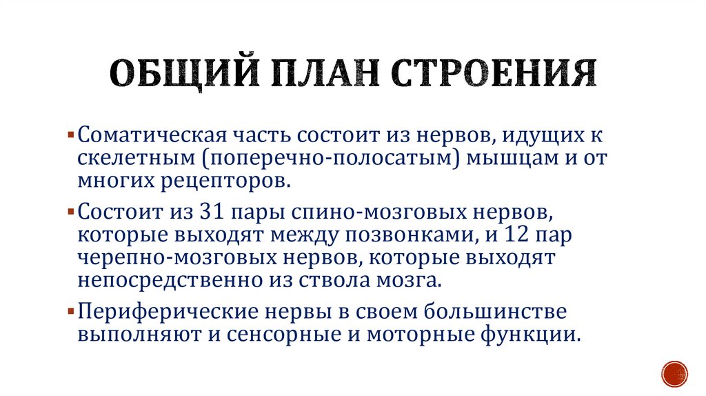 Соматическая часть состоит из нервов, идущих кскелетным (поперечно-полосатым) мышцам и от