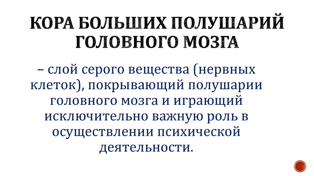 – слой серого вещества (нервныхклеток), покрывающий полушарии