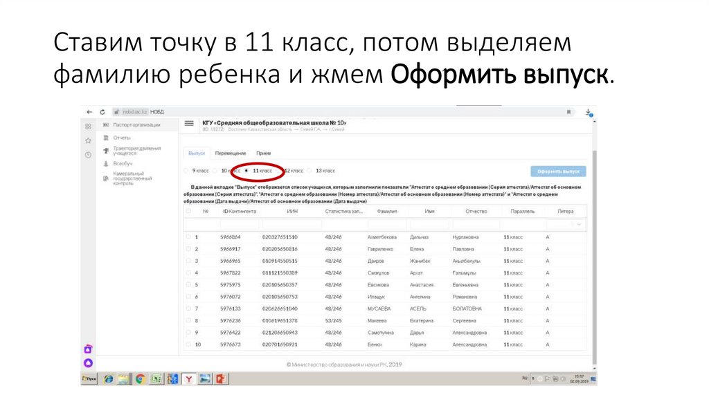 Ставим точку в 11 класс, потом выделяемфамилию ребенка и жмем Оформить выпуск.