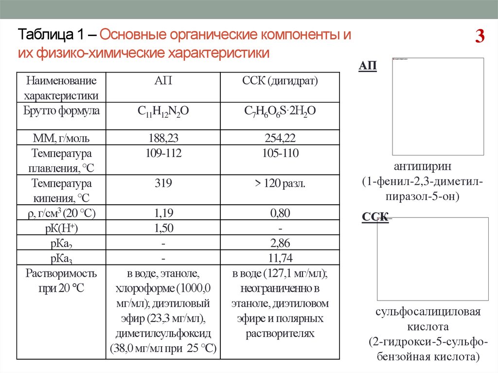Таблица 1 – Основные органические компоненты иих физико-химические характеристики