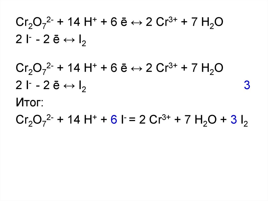 Cr2O72- + 14 H+ + 6 ē ↔ 2 Cr3+ + 7 H2O2 I- - 2 ē ↔ I2