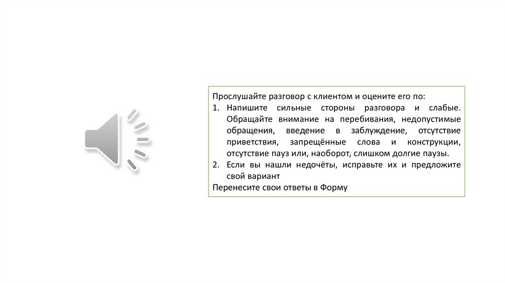 Прослушайте разговор с клиентом и оцените его по:1. Напишите сильные стороны разговора и слабые.