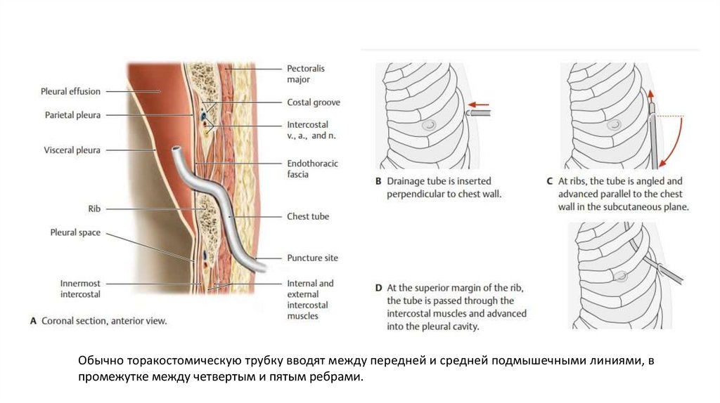 Обычно торакостомическую трубку вводят между передней и средней подмышечными линиями, впромежутке между четвертым и пятым ребрами.