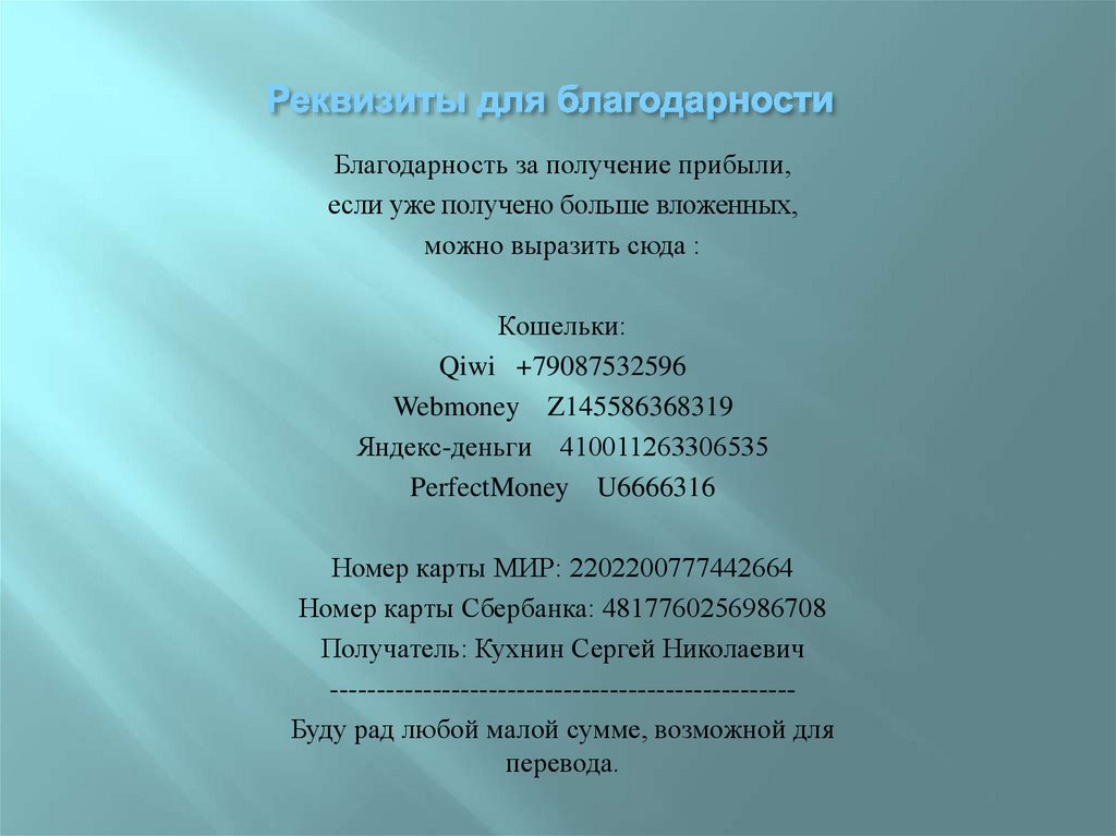 -------------------------------------------------Буду рад любой малой сумме, возможной для