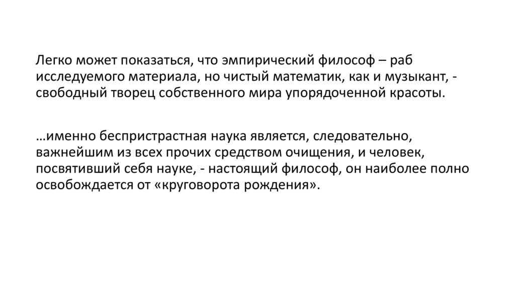 Легко может показаться, что эмпирический философ – рабисследуемого материала, но чистый математик, как и музыкант, свободный творец собственного мира упорядоченной красоты.