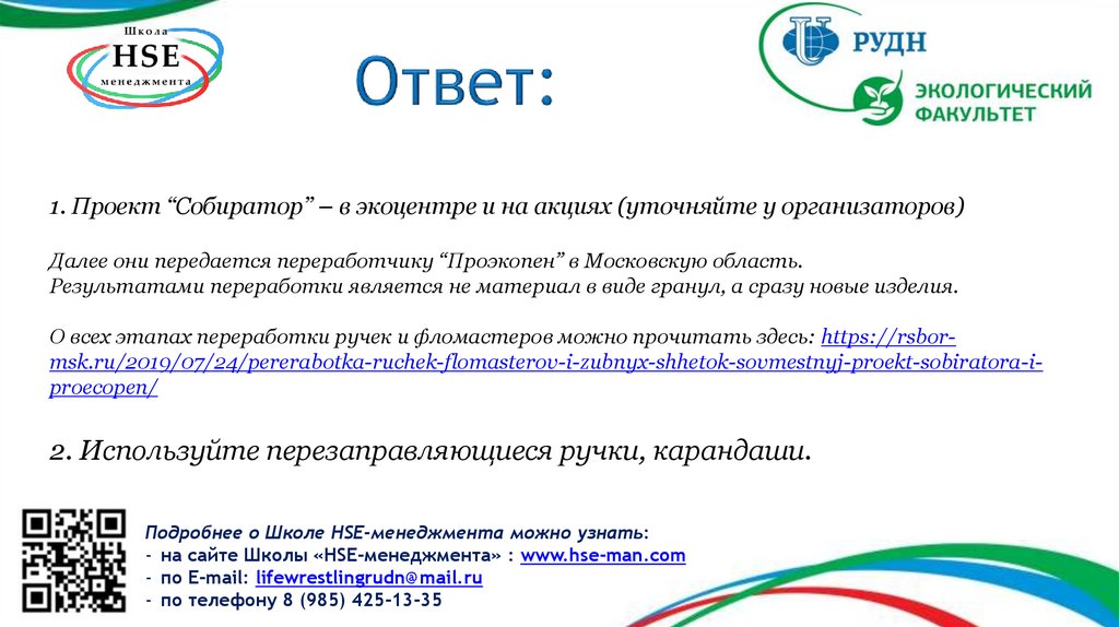1. Проект “Собиратор” – в экоцентре и на акциях (уточняйте у организаторов)Далее они передается переработчику “Проэкопен” в Московскую область.
