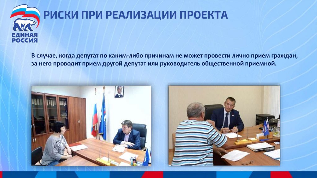 В случае, когда депутат по каким-либо причинам не может провести лично прием граждан,за него проводит прием другой депутат или руководитель общественной приемной.