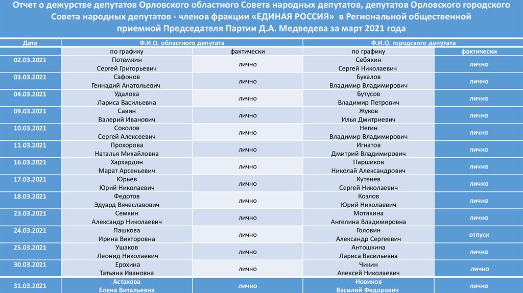 Отчет о дежурстве депутатов Орловского областного Совета народных депутатов, депутатов Орловского городскогоСовета народных депутатов - членов фракции «ЕДИНАЯ РОССИЯ» в Региональной общественной