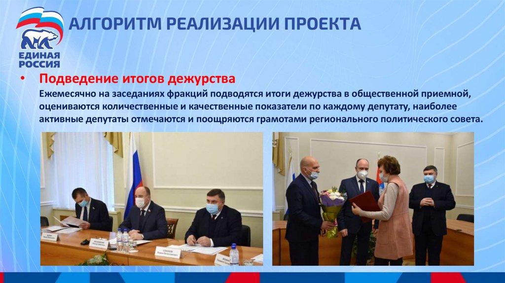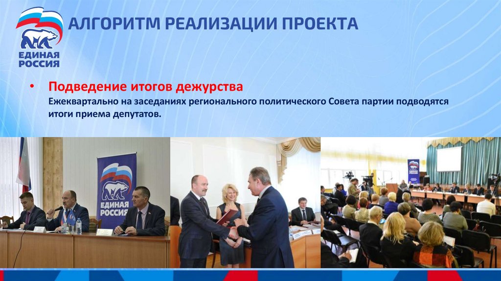• Подведение итогов дежурстваЕжеквартально на заседаниях регионального политического Совета партии подводятся