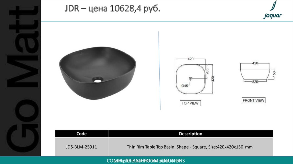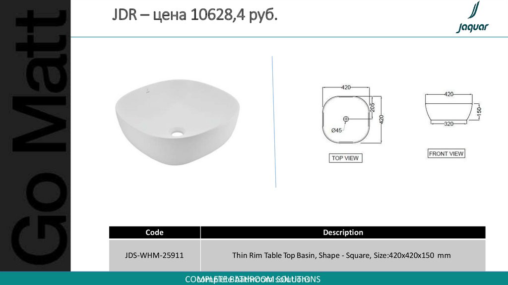 Thin Rim Table Top Basin, Shape - Square, Size:420x420x150 mm
