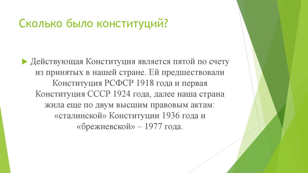 Сколько было конституций?Действующая Конституция является пятой по счету