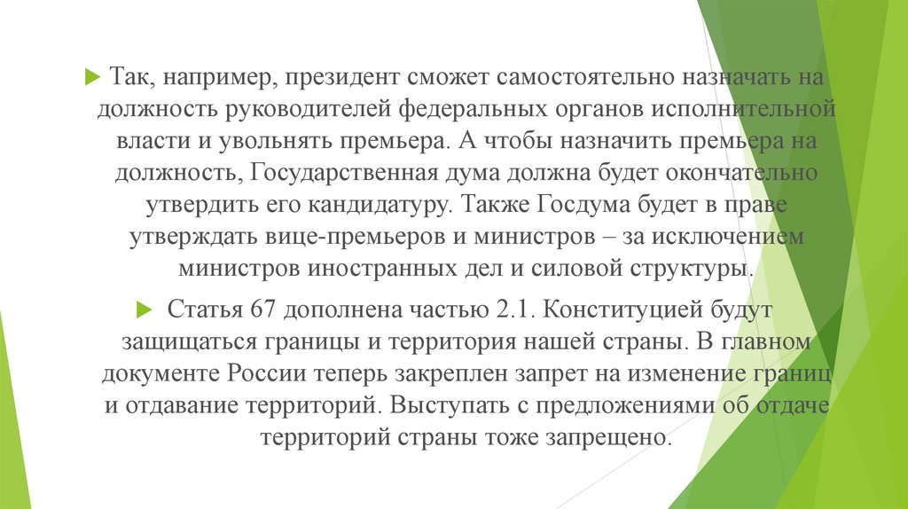 Так, например, президент сможет самостоятельно назначать надолжность руководителей федеральных органов исполнительной