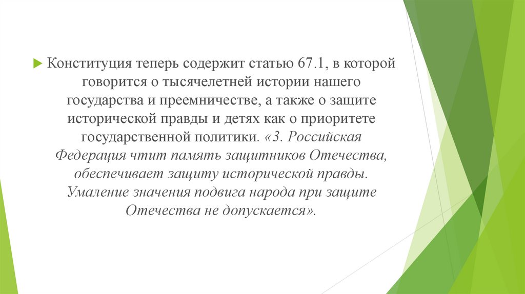 Конституция теперь содержит статью 67.1, в которойговорится о тысячелетней истории нашего