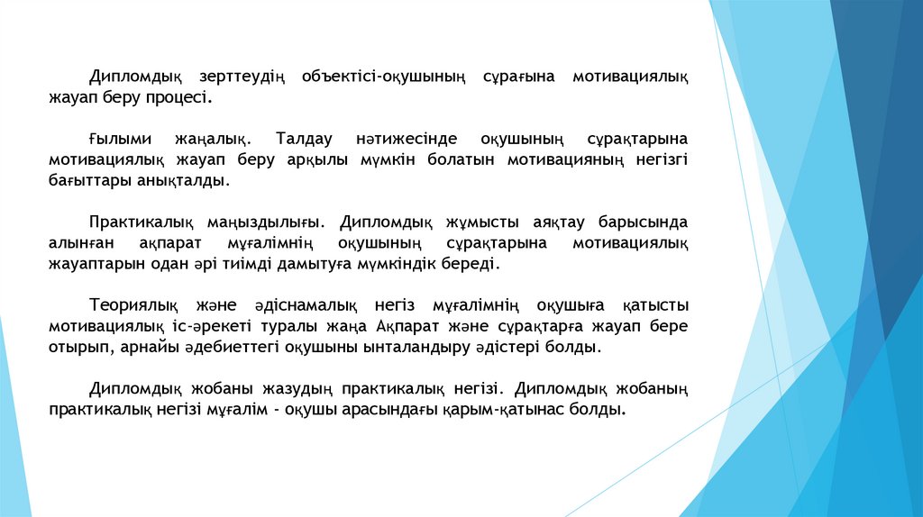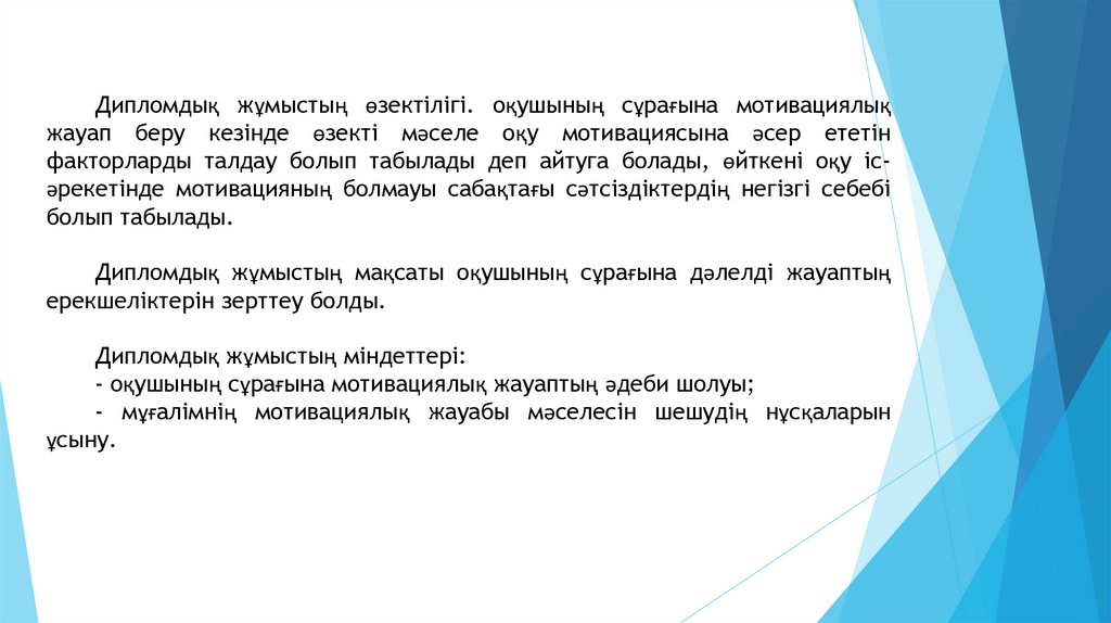 Дипломдық жұмыстың өзектілігі. оқушының сұрағына мотивациялықжауап беру кезінде өзекті мәселе оқу мотивациясына әсер ететін